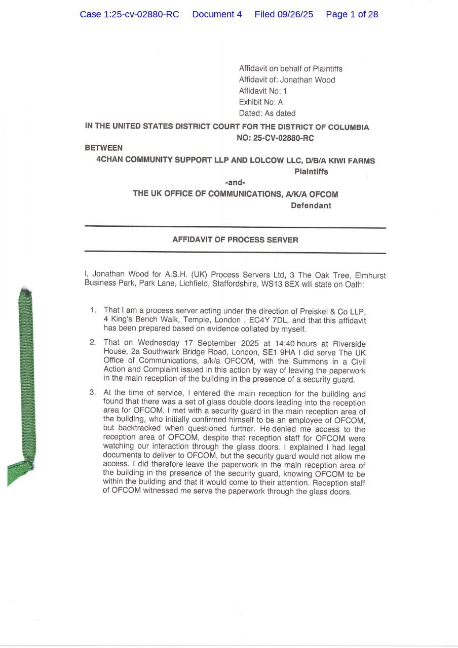 Ofcom has been SERVED in the case of 4chan, Kiwi Farms v. Ofcom